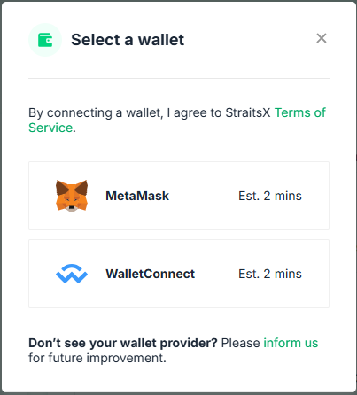 Step 5: Select “MetaMask” or “WalletConnect”, depending on the wallet provider you are using.