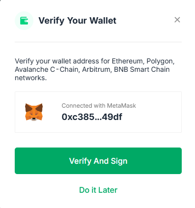 Step 6: Once you have connected your respective wallet, you will be asked to verify and sign to whitelist your blockchain address to your StraitsX account. From here, click on “Verify and Sign”. By doing so, your wallet will be automatically whitelisted for Ethereum, Polygon, Avalanche C-Chain, Arbitrum, and BNB Smart Chain networks simultaneously. You can also select "Do It Later" if you decide to link it later.