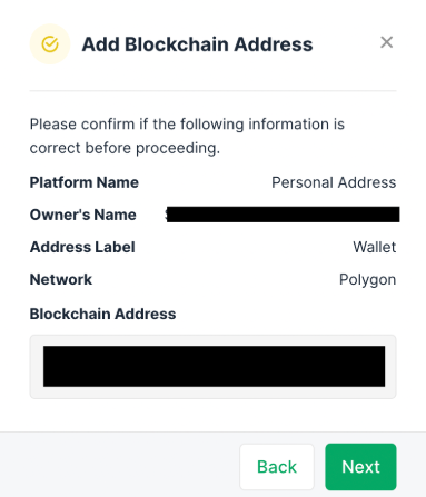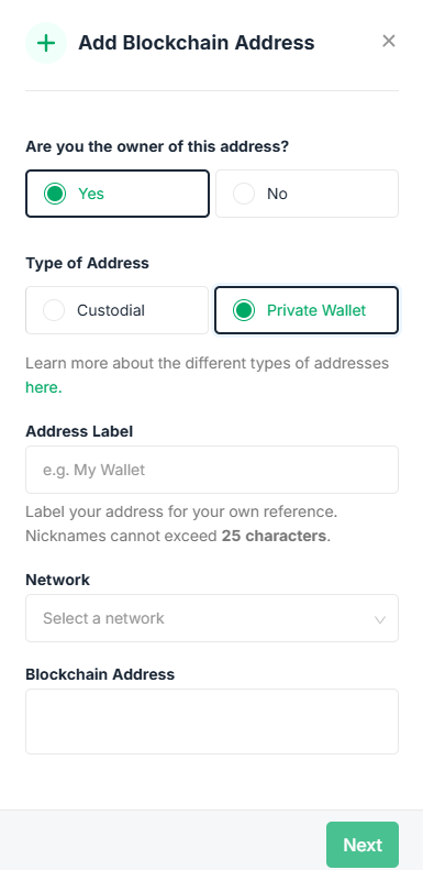 Type of Address: Choose "Custodial" (exchange/wallet platform) or "Private Wallet" (non-custodial).
