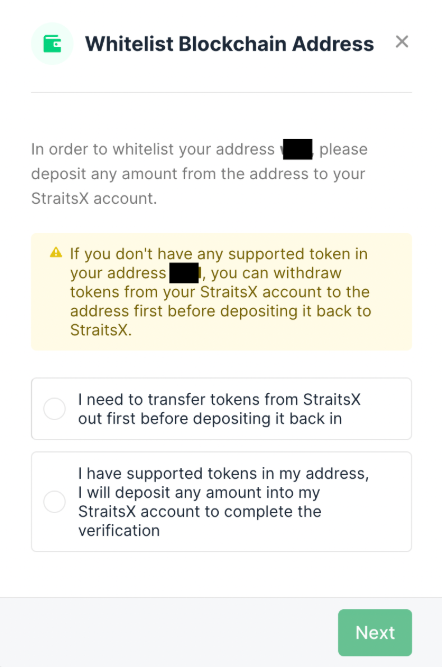 Step 8: Please note that to complete the whitelisting process for a personal address (non-custodial address), you need to verify ownership by making a deposit from that address to your StraitsX account. There are two ways to complete this process: