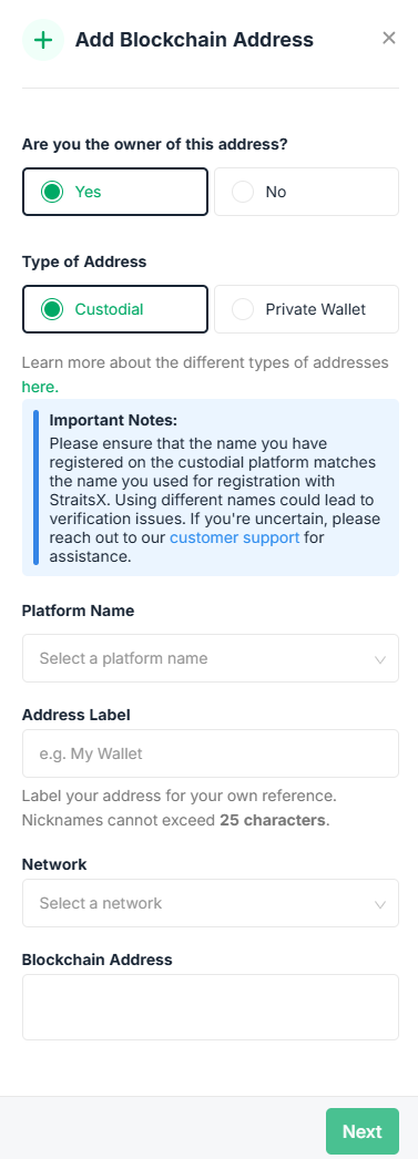 If Custodial, ensure the name registered on the custodial platform matches your StraitsX account name to avoid verification issues.