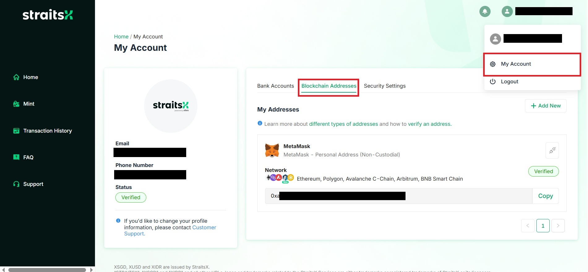 - If you already have supported tokens in your blockchain address, you can directly deposit any amount of supported stablecoins from your blockchain address to your StraitsX account. Once the deposit is confirmed, your address will be whitelisted.