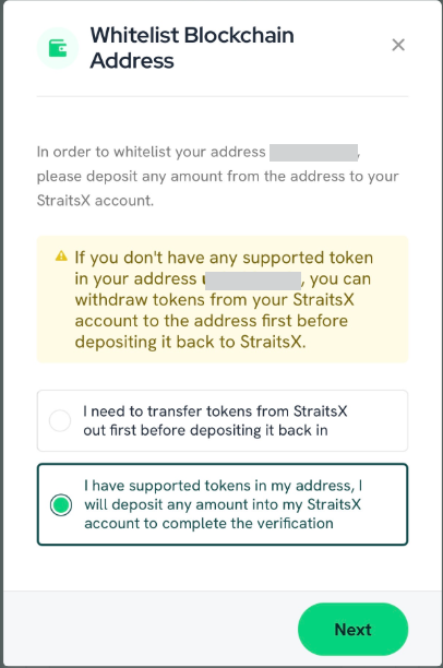 - If you do not have any supported tokens in your blockchain address: First, withdraw a small amount of supported stablecoins from your StraitsX account to your blockchain address. Then, deposit back from your blockchain address to StraitsX to complete the verification.