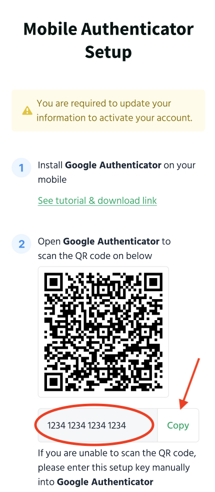 On StraitsX Mobile Authenticator page, copy the setup key.