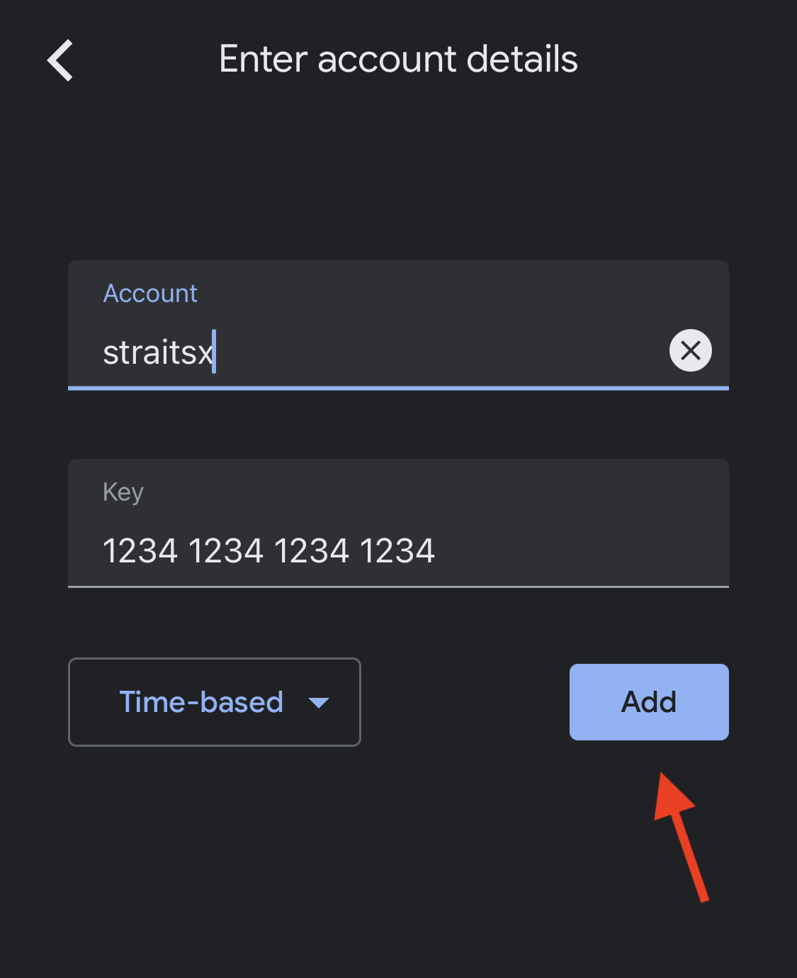 Go back to the setup page on StraitsX and copy the setup key to Google Authenticator.