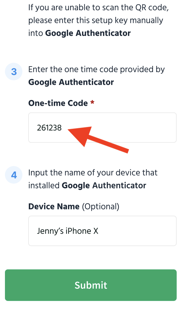 - Input the name of your device that install Google Authenticator (eg: Jenny's iPhone X)